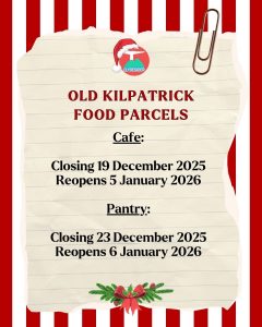 Latest News Christmas Opening Hours OKFP Christmas Opening Hours Please note that Old Kilpatrick Food Parcels Cafe will be closed from Friday 19th December and will reopen on Monday 5th January 2026. The Food Read More » 19 December 2025 No Comments The King's Award for Voluntary Service Dunbartonshire charity wins prestigious royal award A local charity set up to help the community during the COVID pandemic and which still supports tens of thousands of people, has received one Read More » 5 August 2025 No Comments Our Partners